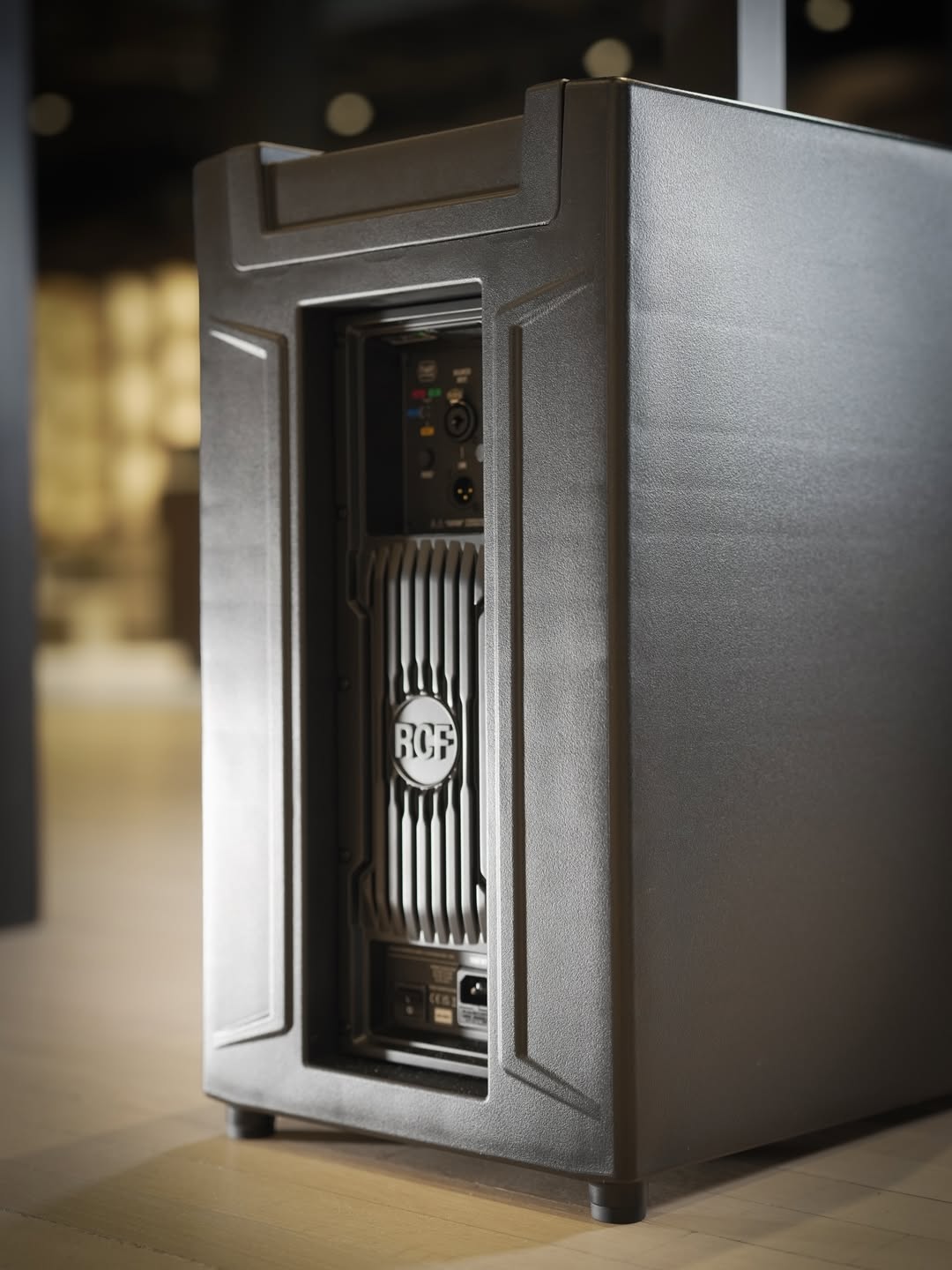 Phía sau sub là khối amplifier RCF signature gắn trên tản nhiệt nhôm đúc nguyên khối — không có quạt, hoàn toàn passive cooling. Không gian bar yên tĩnh lúc vắng khách, và cái này quan trọng hơn nhiều người nghĩ: tuyệt đối không có tiếng ồn nền từ thiết bị.