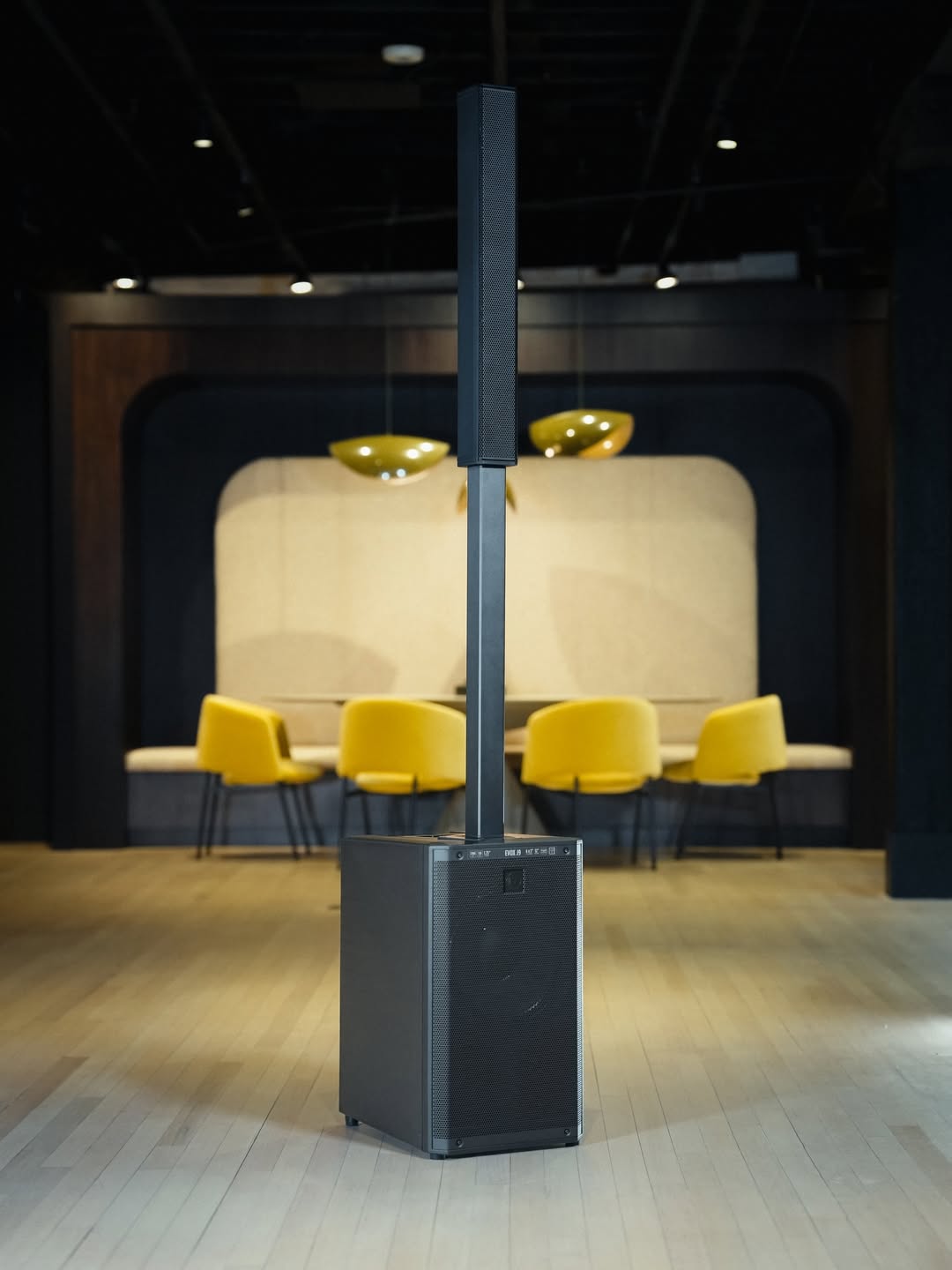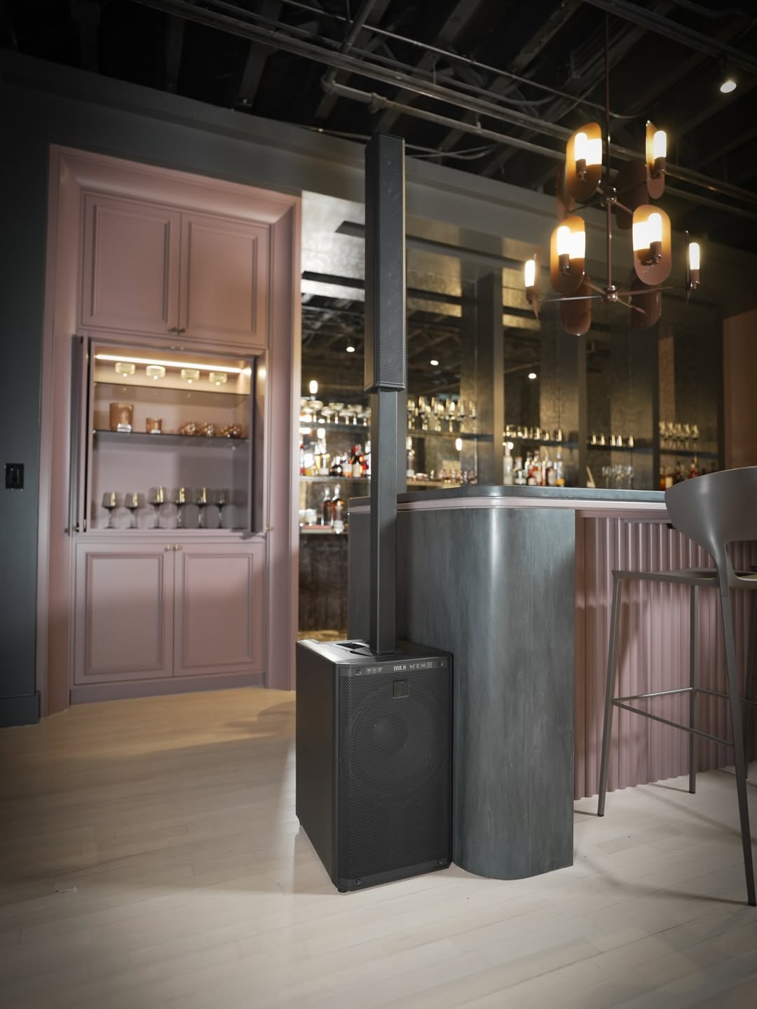 Điều đầu tiên đập vào mắt là phần magnetic pole connector — lắp cột loa vào sub chỉ mất đúng 30 giây, không cần vặn ốc, không cần căn chỉnh. Hệ thống còn cho phép điều chỉnh 2 độ cao khác nhau tùy theo vị trí đặt, rất linh hoạt khi bố trí theo góc quầy bar hay giữa phòng.