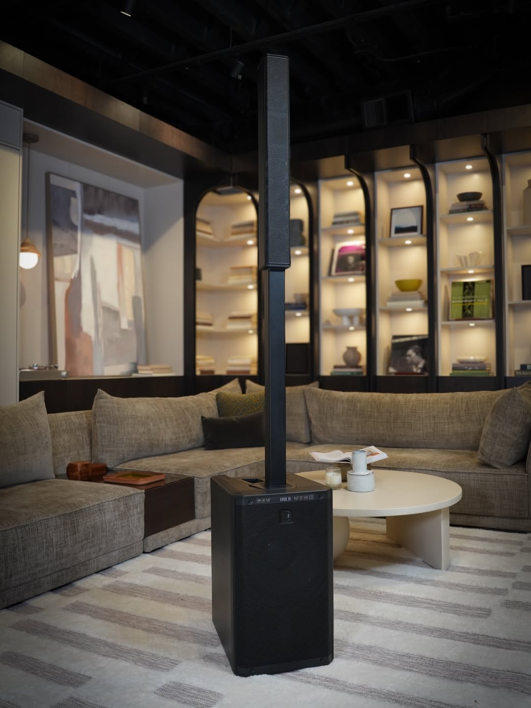 Nói thật, đây là lý do tôi chọn EVOX J9 thay vì nhiều loa trụ khác trên thị trường. Thiết kế slim column + sub box với màu đen mờ và grille steel mesh tạo ra profile cực kỳ gọn và sang. Đặt ở góc quầy bar hoặc giữa phòng, nó trông như một phần của thiết kế nội thất hơn là một thiết bị âm thanh. Khách của tôi nhiều lần hỏi “cái cột đen kia là gì” với vẻ tò mò tích cực, chứ không phải phàn nàn “sao để loa to vậy”.